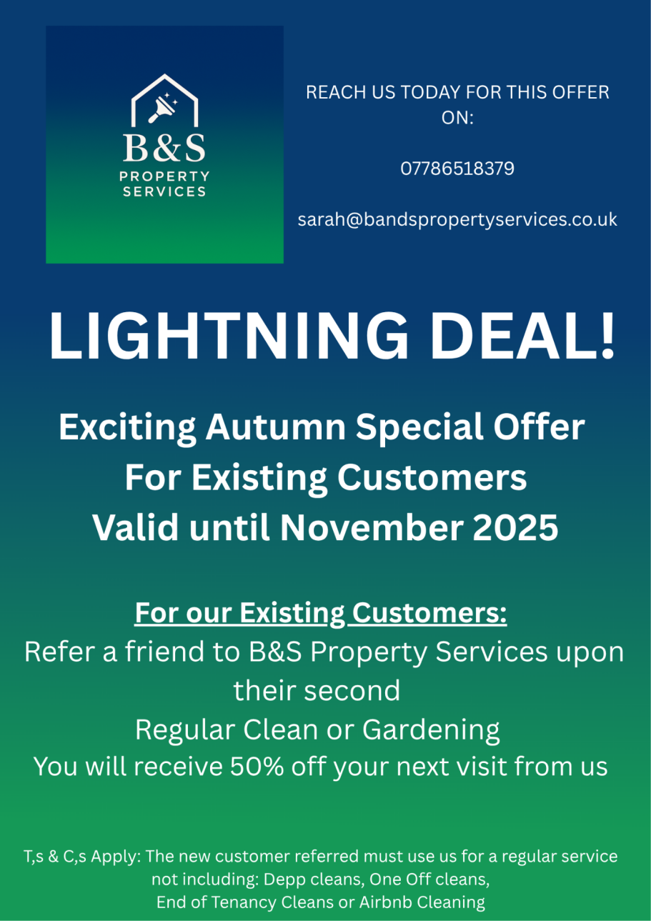 If you are an existing customer, we do not forget you at B&S Property Services. As we thank you for your business, here is an Autumn offer for you also, reach out to us to claim your offer