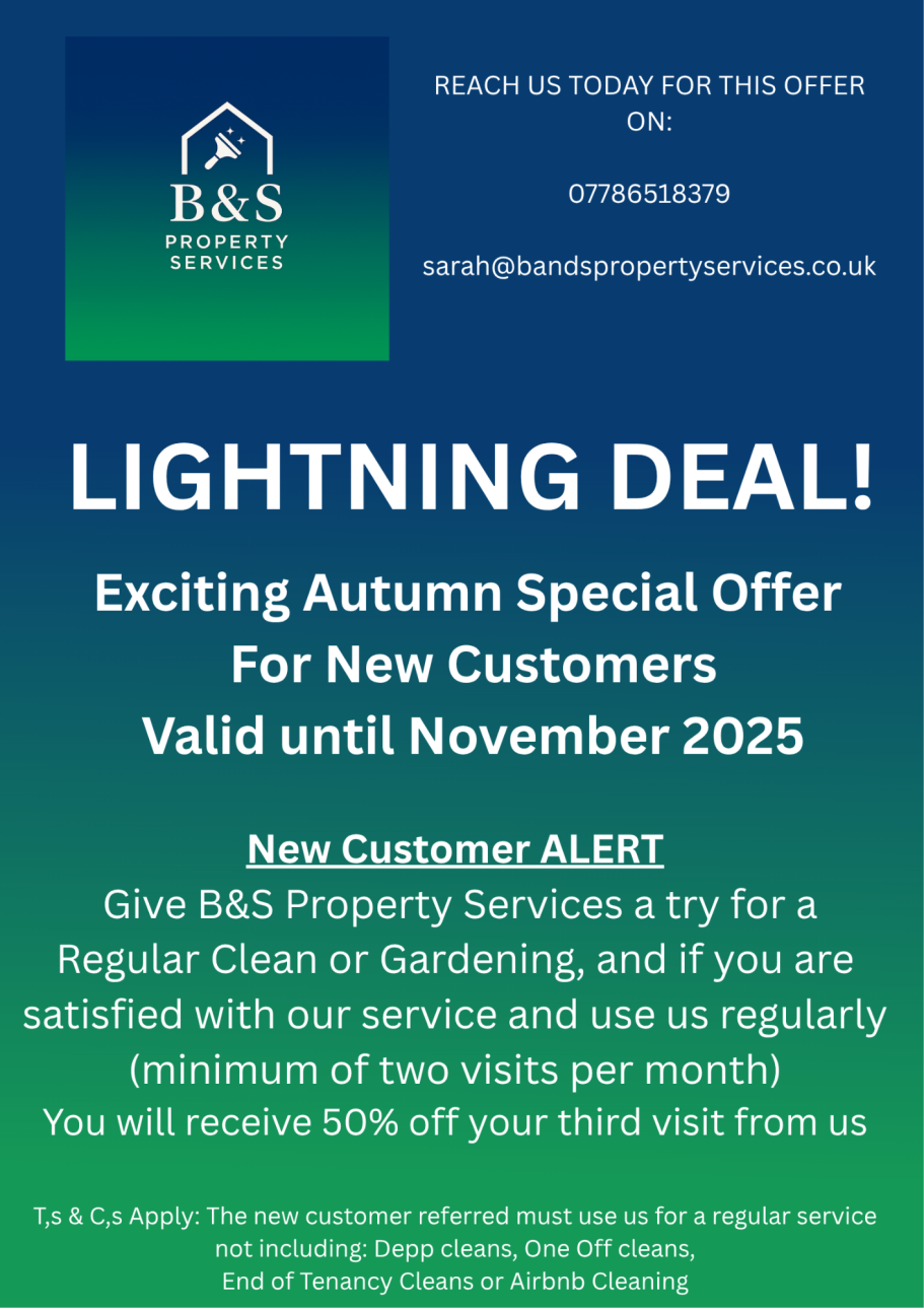 If you're looking for your next or new cleaner or gardener, why not give B&S Property Services a try with our fab new autumn offer available? Reach out today